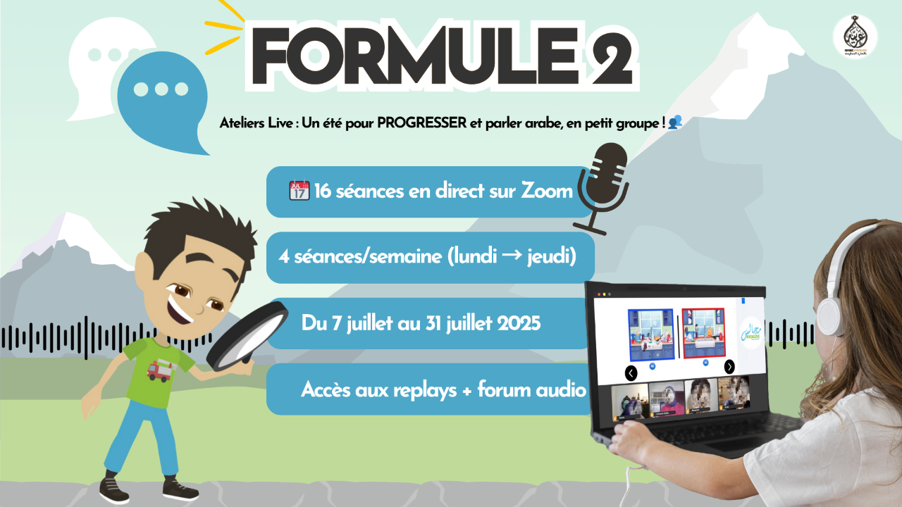 Le Pack Été Live est une formule 100 % interactive du Summer Camp d’Arabic Immersion, conçue pour permettre à votre enfant de pratiquer l’arabe littéral à l’oral de manière régulière, vivante et motivante.